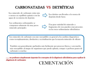 Este documento describe las características de las rocas sedimentarias carbonatadas. Explica que las rocas carbonatadas se componen principalmente de calcita y otros minerales de carbonato como la dolomita y la aragonita. También describe los procesos de diagénesis y cementación que experimentan las rocas carbonatadas después de su deposición. Resalta que la mayor parte del carbonato de calcio proviene de fuentes biológicas como conchas y esqueletos de organismos marinos.