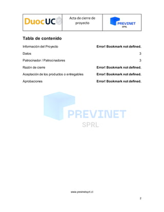 Este documento presenta el acta de cierre del proyecto PreviNET Sistema administrativo de gestión de prevención de riesgos laborales de la empresa Apryma Prevención de riesgos. El proyecto se cierra debido a la entrega de todos los productos acordados. Se enumeran y aceptan la mayoría de los entregables, con algunas observaciones. Finalmente, se autoriza al gerente de proyectos a continuar con el proceso formal de cierre.