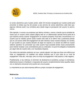Este documento discute el concepto de "engagement" en el contexto del análisis web. Define el engagement como la acción de los usuarios en relación con una marca o producto, que puede ser positivo o negativo. Explica que las métricas como usuarios únicos, frecuencia de visitas y tiempo en el sitio miden el nivel de engagement pero no si es positivo o negativo. Proporciona ejemplos de cómo las mismas métricas podrían indicar engagement positivo o negativo dependiendo del contexto. Concluye que cada empresa debe definir su propio