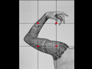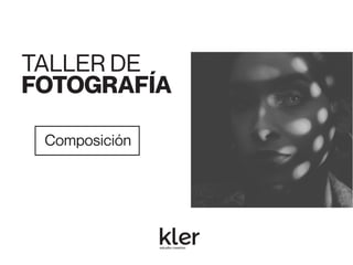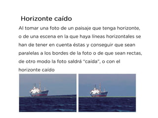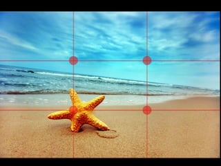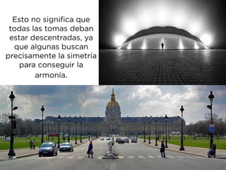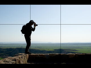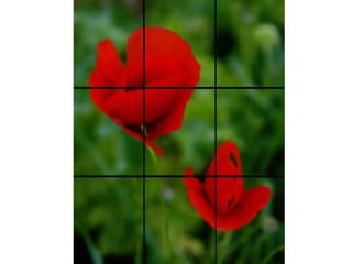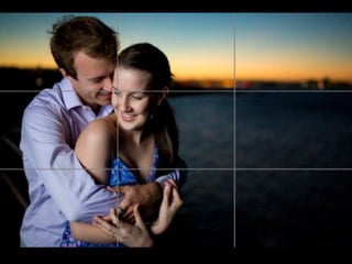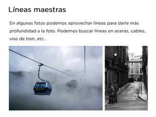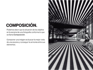 Este documento habla sobre la composición fotográfica. Explica que la composición es la disposición de los objetos en la escena y que es importante seleccionar qué elementos incluir y cuáles excluir para lograr armonía. Describe la regla de los tercios, que divide la imagen en nueve partes iguales, y recomienda colocar puntos fuertes como sujetos en las intersecciones de las líneas de tercios para dar más fuerza a la imagen. También cubre otros temas como el uso de líneas, fondos, enmarcados y