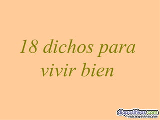 Este documento presenta 18 dichos para vivir bien, incluyendo: persiga metas alcanzables, sonría genuinamente, comparta con los demás, ayude a los necesitados, mantenga un espíritu joven, relaciónese con diferentes personas, mantenga la calma bajo presión, use el humor para aliviar el estrés, perdone a quienes lo incomoden, tenga amigos en quienes confiar, coopere para obtener recompensas, valore cada momento con sus seres queridos, mantenga la confianza y autoestima