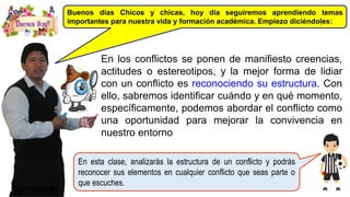 Este documento describe cómo analizar la estructura de un conflicto. Explica que un conflicto está compuesto de tres elementos: las personas involucradas, el proceso, y el problema o problemas subyacentes. Detalla preguntas para identificar cada uno de estos elementos en un conflicto específico. Finalmente, pide a los estudiantes que analicen la estructura de un conflicto personal usando un cuadro proporcionado y que desarrollen una guía para manejar conflictos futuros.