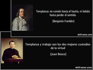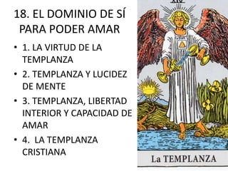Este documento describe la virtud de la templanza. Explica que la templanza modera la atracción por los placeres y procura el equilibrio en el uso de los bienes creados. Discute las virtudes subordinadas a la templanza como la vergüenza, la honestidad, la abstinencia y la sobriedad. Finalmente, señala que la templanza cristiana toma como modelo a Cristo y busca el dominio de sí mismo para poder amar libremente.