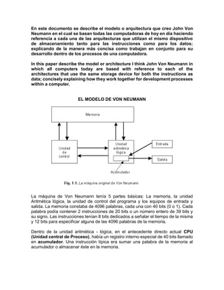 El documento describe el modelo de arquitectura de computadora propuesto por John von Neumann, el cual se basa en usar el mismo dispositivo de almacenamiento tanto para instrucciones como datos. Explica que la máquina de von Neumann tenía cinco partes principales: memoria, unidad aritmética lógica, unidad de control de programa y equipos de entrada y salida. Asimismo, describe que una computadora moderna está formada por tres unidades funcionales principales: la unidad central de proceso, la memoria principal y la unidad de entrada y salida.