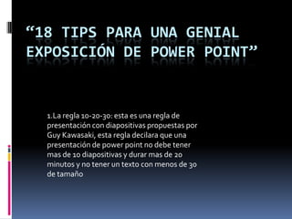 Este documento ofrece 18 consejos para mejorar las presentaciones de PowerPoint. Algunos de los consejos clave son: seguir la regla 10-20-30 para limitar el número de diapositivas y la duración de la presentación; contar historias y anécdotas para crear una conexión emocional con la audiencia; y practicar para mejorar las habilidades de oratoria y ganar confianza.
