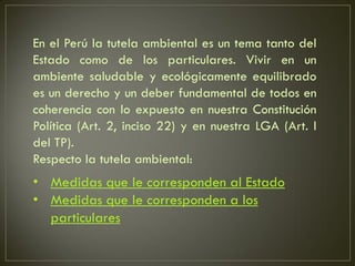 Este documento presenta una descripción detallada de las diferentes acciones y procedimientos legales relacionados con la tutela ambiental en el Perú, incluyendo acciones civiles como la responsabilidad extracontractual y la nulidad de actos jurídicos, acciones constitucionales como el amparo y la acción popular, y procedimientos administrativos como la denuncia, la evaluación previa con silencio administrativo, y el procedimiento administrativo sancionador. El documento también introduce brevemente el nuevo Tribunal de Solución de Controversias Ambiental como la má