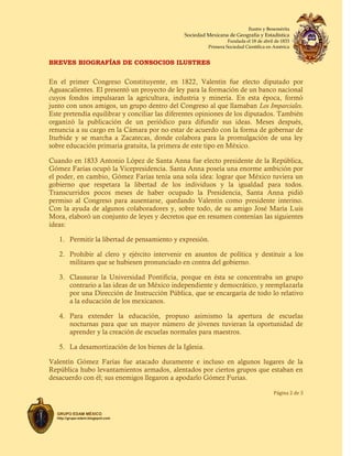Valentín Gómez Farías fue un médico y político mexicano que jugó un papel fundamental en la independencia y formación de México como nación. Sirvió como vicepresidente y presidente interino en 1833, durante el cual promulgó reformas liberales como la libertad de expresión, educación pública y desamortización de la Iglesia. A pesar de la oposición, continuó luchando por la democracia y igualdad, presenciando la firma de la constitución de 1857. Fue un defensor incansable de los derechos individuales