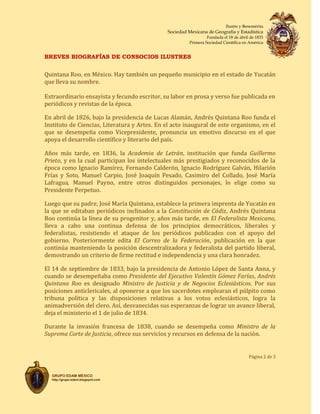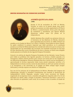 Andrés Quintana Roo fue un político, periodista y poeta mexicano que participó activamente en la lucha por la independencia de México. Fue miembro del Congreso de Chilpancingo y presidió la asamblea constituyente que declaró la independencia en 1813. Más tarde ocupó varios cargos públicos como diputado, senador y secretario de estado. El estado mexicano de Quintana Roo lleva su nombre en honor a sus contribuciones a la independencia y a la política del país.