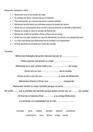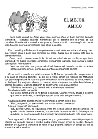 Mohamed vivía en Argel y transportaba mercancías a través del desierto con la ayuda de sus camellos. Tuvo problemas económicos y tuvo que vender todos sus animales excepto su camello favorito. Omar, un rico comerciante, quería comprar el camello. Cuando Omar visitó a Mohamed, este le ofreció una gran cena a pesar de haber vendido su último camello para poder hacerlo. Mohamed valoraba más la amistad que cualquier posesión material.