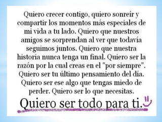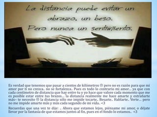 Este documento es una colección de mensajes de amor y afecto entre dos personas que se aman pero que se encuentran separados por la distancia. A través de los mensajes expresan cuánto se extrañan y añoran estar juntos, prometen luchar por su amor a pesar de los obstáculos, y afirman que su amor es fuerte y perdurará para siempre.