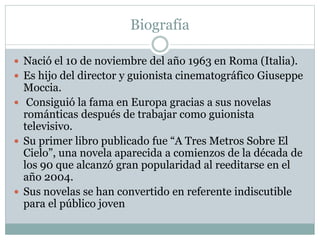 Federico García Moccia nació en Roma en 1963. Es un escritor italiano que alcanzó fama en Europa gracias a sus novelas románticas para jóvenes después de trabajar como guionista televisivo. Su primera novela publicada fue "A Tres Metros Sobre El Cielo" en los años 90, la cual alcanzó gran popularidad al reeditarse en 2004 y ser adaptada al cine. Moccia ha escrito otras novelas populares como "Tengo Ganas de Ti", "Perdona si te llamo amor" y "Carolina
