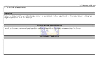 Este documento presenta la lección sobre oficios impartida a un grupo de 2o grado. La lección tuvo como propósito que los estudiantes desarrollen estrategias de lectura para comprender y divertirse al leer un texto con versos sobre oficios. La secuencia didáctica incluyó una actividad para activar conocimientos previos sobre oficios, la creación colaborativa de un cuento sobre oficios siguiendo el modelo de un libro de lecturas, y la evaluación de la participación y aplicación de estrategias de lectura de los estudiant