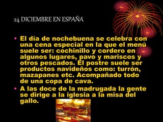 El documento describe las tradiciones de Navidad en varios países, incluida España, Francia y Finlandia. En España, la Nochebuena se celebra con una cena especial que incluye cochinillo, cordero, pavo o mariscos, seguida de una misa a medianoche. El día de Navidad se reúne la familia ampliada para una gran comida. En Francia, la cena de Nochebuena suele incluir pavo y termina con una bûche de Noël, y a veces precede de mariscos. En Finlandia, el momento importante de la c