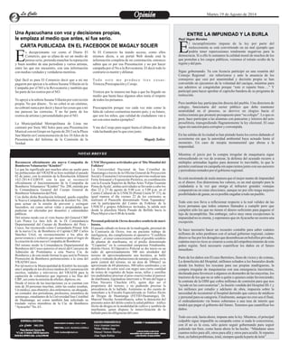 El documento contiene varias noticias breves de la región de Ayacucho, Perú. Incluye una carta de la cantante Magaly Solier cuestionando un artículo del diario El Comercio, el reconocimiento oficial de una nueva compañía de bomberos voluntarios, y actividades planeadas por la Universidad Nacional de San Cristóbal de Huamanga para conmemorar el Día Mundial del Folklore. También reporta sobre el descubrimiento de una plantación de marihuana y cuestionamientos a candidatos por no cumplir con obligaciones
