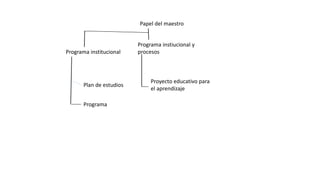 Este documento describe los componentes clave de un proyecto educativo institucional exitoso. Debe incluir un proyecto didáctico con estrategias pedagógicas fundamentadas, metas claras y pasos definidos alineados con el currículo. También requiere una adecuada asignación de recursos como el tiempo y materiales. El maestro desempeña un papel fundamental en la implementación del proyecto de acuerdo con el programa institucional.