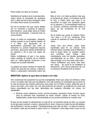 Jesús se retira a orar solo en la montaña mientras sus discípulos cruzan el lago en barca. Una tormenta azota el lago y los discípulos se asustan, pero Jesús camina sobre las aguas hacia ellos. Pedro le pide a Jesús que le permita caminar sobre las aguas también, y lo hace hasta que duda y empieza a hundirse, pero Jesús lo salva. Todos reconocen entonces que Jesús es el Hijo de Dios.