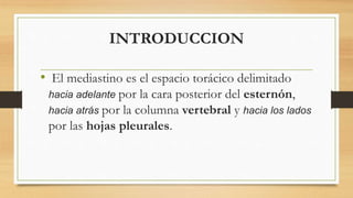 La mediastinitis es la inflamación aguda o crónica del tejido conectivo laxo del mediastino. Puede ser causada por infecciones cervicales descendentes, perforaciones esofágicas, cirugías torácicas u otras causas. El tratamiento requiere antibióticos de amplio espectro, drenaje quirúrgico temprano del mediastino y manejo multidisciplinario. El diagnóstico precoz y tratamiento oportuno son fundamentales para mejorar los resultados, ya que la mediastinitis tiene alta mortalidad si no se
