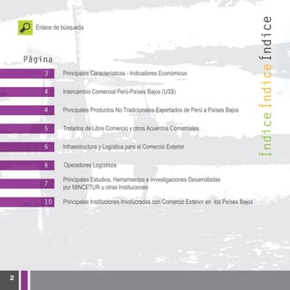 Este documento provee una guía práctica sobre los Países Bajos. Incluye información sobre indicadores económicos, intercambio comercial con Perú, principales productos exportados, tratados de libre comercio, infraestructura logística, operadores logísticos, estudios de mercado relevantes desarrollados por el MINCETUR y otras instituciones, y las principales instituciones involucradas con el comercio exterior en los Países Bajos.