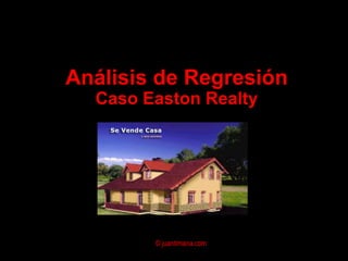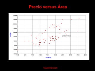 El documento presenta un análisis de regresión para estimar la relación entre el precio y el área de viviendas. Explica conceptos clave como la ecuación de regresión, el coeficiente de correlación, el método de mínimos cuadrados y supuestos del modelo de regresión lineal. Finalmente, analiza posibles problemas como la multicolinealidad y heterocedasticidad.