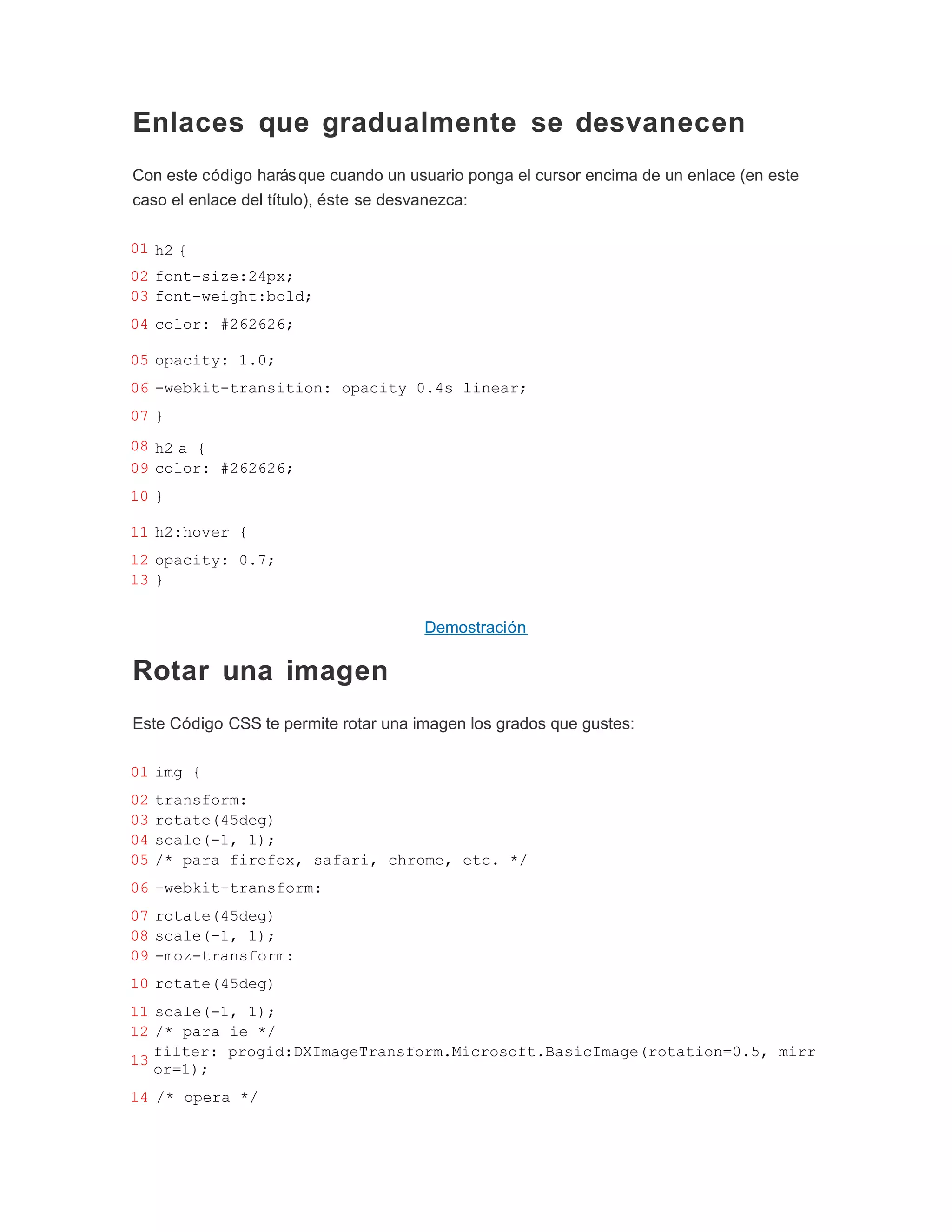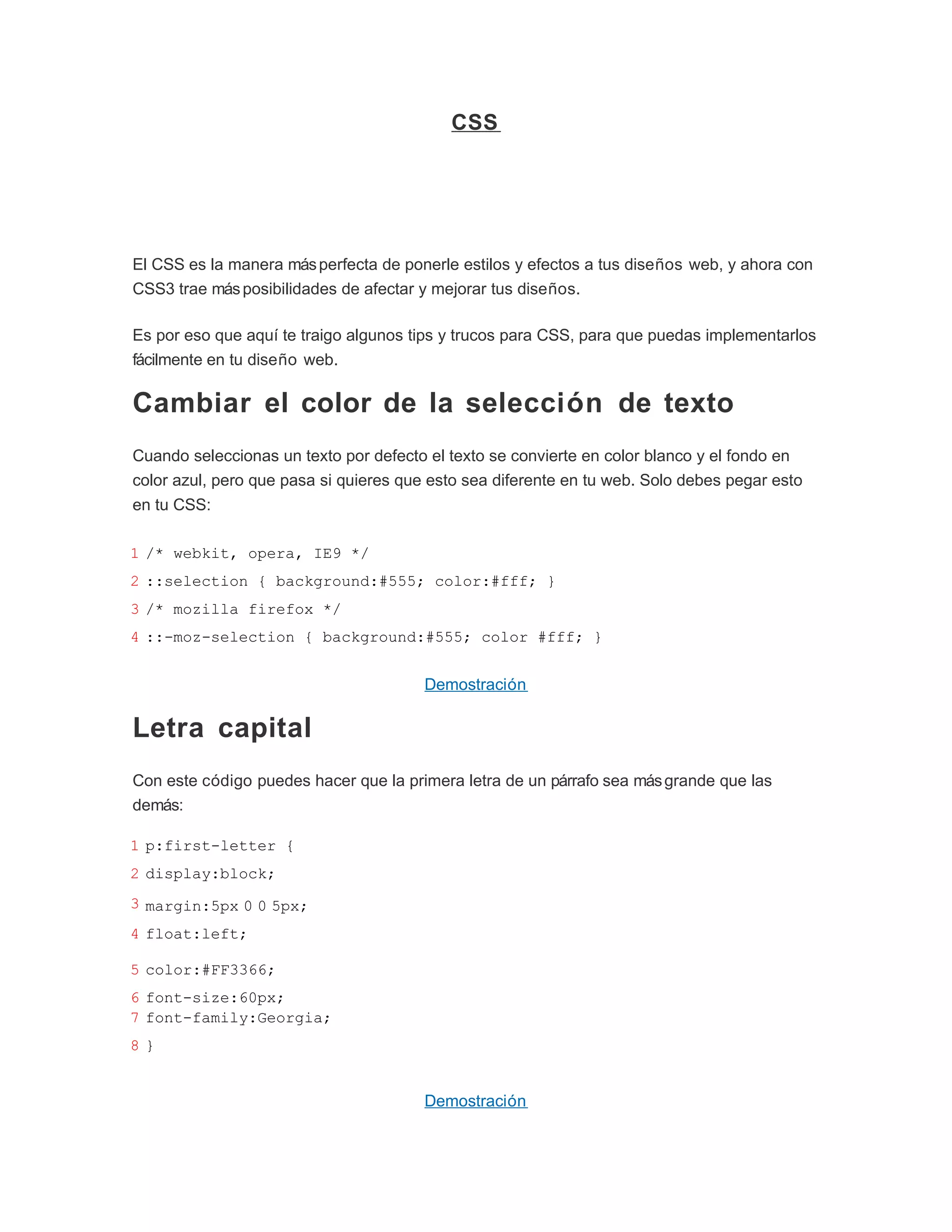 Este documento proporciona numerosos ejemplos de código CSS para aplicar diferentes estilos y efectos en diseños web, incluyendo cómo cambiar el color de la selección de texto, agregar una letra capital inicial, hacer que los enlaces se desvanezcan gradualmente al pasar el cursor, rotar e imágenes, mover el texto de un enlace al hacer clic, aplicar estilos para dispositivos móviles y más. El documento también incluye ejemplos de cómo usar hacks CSS para diferentes navegadores y animar elementos como listas y tabs solo con CSS