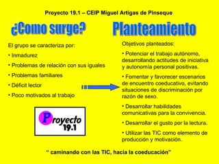 Este proyecto tuvo como objetivos promover el trabajo autónomo, habilidades comunicativas, gusto por la lectura y uso de las TIC entre un grupo de estudiantes. Los estudiantes realizaron un viaje virtual con seis paradas donde conocieron personajes históricos, creando materiales como blogs, wikis y cortometrajes sobre temas como la coeducación y valores. El proyecto se evaluó continuamente considerando tareas, actitud, adquisición de conocimientos y fue interdisciplinario e involucró a las familias.