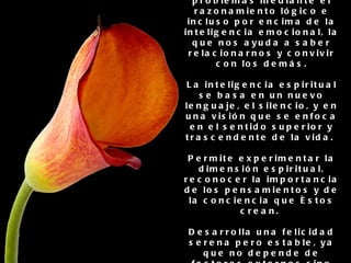 La inteligencia espiritual se basa en una percepción profunda del ser como espiritual y en generar pensamientos positivos alineados con valores internos como la paz y el amor. Esto permite observar desapegadamente las situaciones, comprender a los demás en un nivel profundo y concentrar la mente en pensamientos elevados. El desarrollo de la inteligencia espiritual potencia habilidades como mantener la paz independientemente de las circunstancias y tener buenos deseos hacia todos.