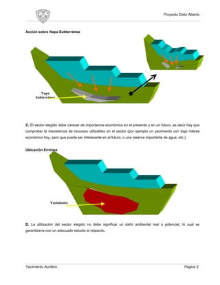 El documento describe los requisitos y consideraciones para el diseño y operación de botaderos para depósito de material estéril extraído de una mina. Se debe seleccionar un lugar que minimice la distancia de transporte, sea geológicamente apto, carezca de recursos económicos actuales o futuros, y no cause daño ambiental. Se debe compactar regularmente el material para garantizar la estabilidad del botadero.
