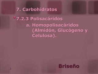 El documento describe los principales tipos de carbohidratos, incluyendo los homopolisacáridos almidón, glucógeno y celulosa. El almidón y el glucógeno son polisacáridos de reserva encontrados en plantas y animales respectivamente, mientras que la celulosa es un polisacárido estructural que forma las paredes celulares de las plantas.