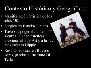 El documento describe el movimiento artístico de los happenings que surgió en Estados Unidos en la década de 1950. Los happenings involucraban eventos efímeros y espontáneos que buscaban la participación activa del público a través de la danza, el cine, la poesía y otras formas. Artistas pioneros como John Cage, Allan Kaprow y Marta Minujin crearon obras emblemáticas de este género en las décadas posteriores. Los happenings cuestionaban la naturaleza del arte y buscaban provocar re