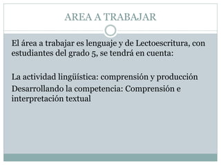 Este documento presenta un proyecto educativo para mejorar las habilidades de lectura de estudiantes de quinto grado a través del uso de herramientas TIC. El proyecto será implementado por dos docentes y se enfocará en desarrollar la comprensión lectora. El documento describe el área de trabajo, los objetivos de aprendizaje como sensibilizar a los estudiantes y motivar la lectura a través de las TIC, y los recursos educativos digitales que se utilizarán. Finalmente, se enfatiza la importancia de evaluar tanto el