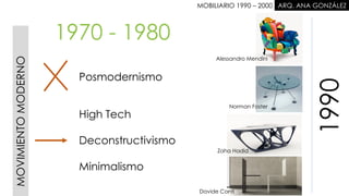 El documento describe las tendencias en el diseño de mobiliario entre 1990 y 2000, incluyendo el high-tech, deconstructivismo, y trabajos de diseñadores como Zaha Hadid, Frank Gehry, Mario Botta, Norman Foster, Rodney Kinsman, Tom Dixon y Alfred Homann. Se enfoca en cómo estas corrientes y diseñadores exploraron nuevos materiales y formas para crear muebles innovadores que reflejaban sus enfoques arquitectónicos.