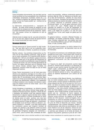 Este documento proporciona información sobre las armas químicas, incluyendo su definición, historia de uso, efectos y desventajas. Brevemente describe que las armas químicas utilizan sustancias tóxicas para causar daño, se han usado de varias formas a lo largo de la historia, y su uso plantea problemas éticos y prácticos.