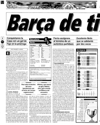 El documento resume la final de la Copa del Rey de 1997 entre el Barcelona y el Betis. El Betis se adelantó en el marcador en los primeros 11 minutos gracias a un gol de Alfonso. Sin embargo, Figo empató para el Barcelona antes del final de la primera mitad. En la segunda mitad, Finidi volvió a dar ventaja al Betis, pero Pizzi empató de nuevo para el Barcelona. Finalmente, Figo anotó en la prórroga para darle la victoria al Barcelona.