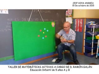 El documento describe un taller de matemáticas activas dirigido por D. Ramón Galán para alumnos de 5 años de Educación Infantil de los grupos A y B del CEIP HOYA ANDREA el 15 de octubre de 2015.