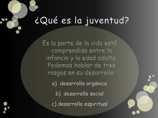 El documento describe el desarrollo orgánico como un proceso cultural en el que el cuerpo y la mente de un joven se transforman gradualmente a través de la autoeducación, la educación receptiva, los esfuerzos y las dificultades para alcanzar la perfección y convertirse en un adulto.