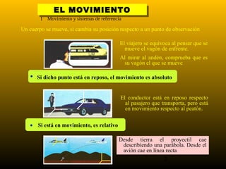 1) La cinemática estudia el movimiento sin considerar las causas que lo producen. 2) El movimiento y el reposo son conceptos relativos que dependen del sistema de referencia elegido. 3) Para describir completamente un movimiento se debe indicar respecto a qué sistema de referencia se realizaron las mediciones.