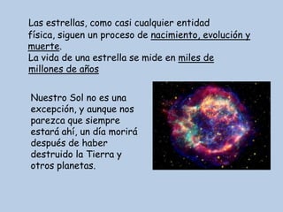 Las estrellas nacen en grandes nubes de gas interestelar llamadas nebulosas debido a la gravedad. Durante su vida, las estrellas queman hidrógeno a través de reacciones nucleares, liberando energía en forma de calor y luz. Cuando se agota el hidrógeno, las estrellas evolucionan hacia gigantes rojas u otras etapas finales como enanas blancas, estrellas de neutrones o agujeros negros, dependiendo de su masa inicial.