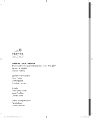 Este documento presenta los derechos de autor y propiedad intelectual de una fundación educacional chilena sobre un libro. Indica que todo el contenido del libro, incluidos textos, imágenes y otros elementos, están protegidos por la ley de propiedad intelectual chilena bajo el registro número 258.979. Se prohíbe el uso no autorizado de la obra, ya sea reproducción, distribución o venta, bajo pena de multas o prisión.