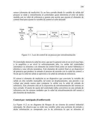 El documento describe los diferentes tipos de acciones de control que pueden usarse en sistemas de control industrial, incluyendo acciones proporcionales, integrales, derivativas y combinaciones de estas. Explica que la temperatura, presión y otros parámetros deben mantenerse regulados mediante controladores acoplados a sensores y elementos de control. Las acciones de control más comunes son proporcional, proporcional-integral, proporcional-derivativa y proporcional-integral-derivativa.