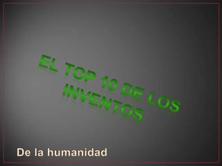 El documento presenta una breve descripción de varios inventos históricos, incluyendo el televisor, el radio, el proyector de diapositivas, la computadora, la bombilla eléctrica, la calculadora, el telar, las gafas y la bicicleta. Para cada invento se proporcionan datos como el inventor y el año de la invención, así como la necesidad que satisfizo y qué se usaba antes. El resumen presenta de manera concisa la información principal del documento.