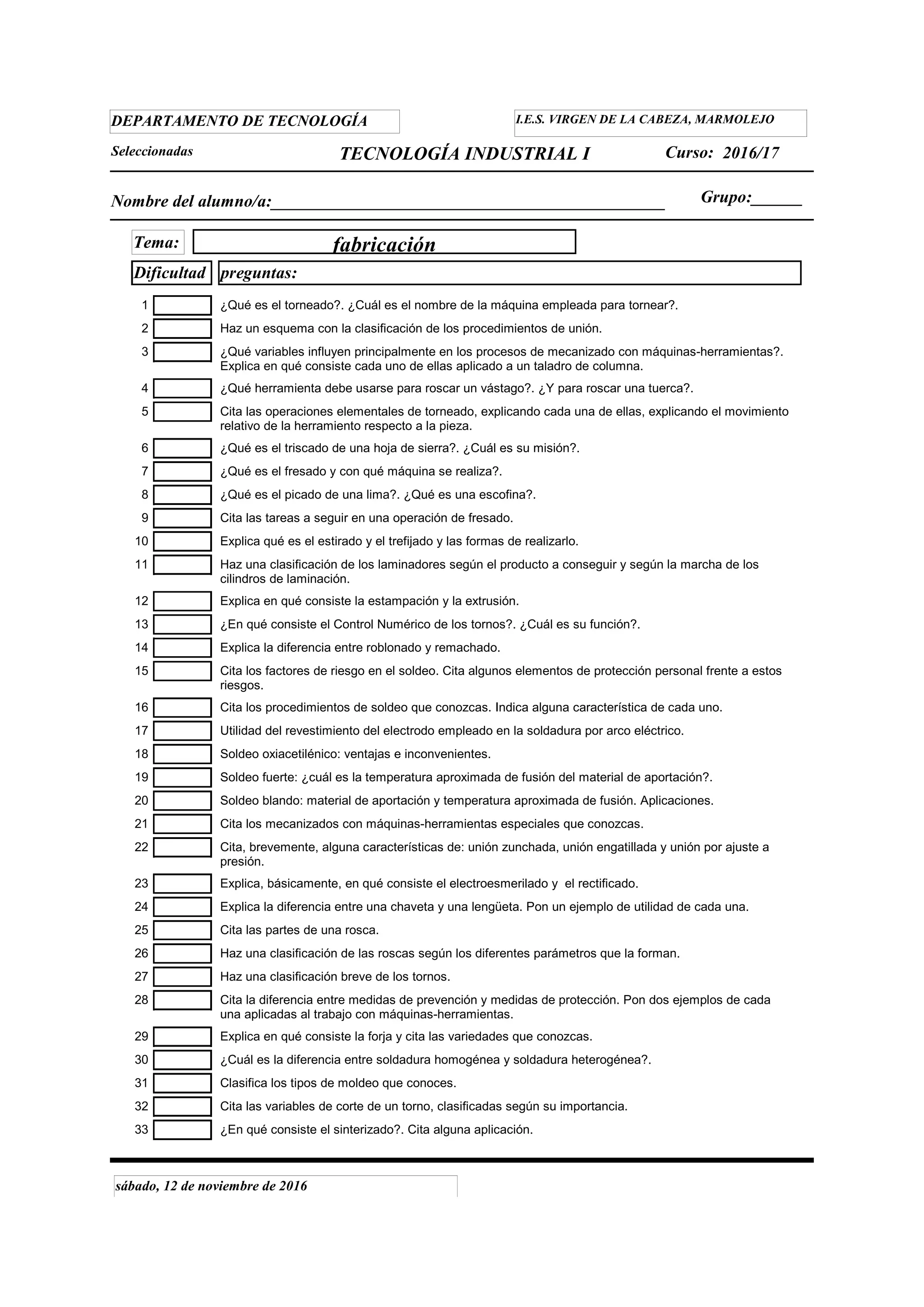 Este documento contiene 38 preguntas sobre diferentes temas relacionados con la fabricación y procesos industriales como el torneado, fresado, soldadura, moldeo y mecanizado con máquinas herramientas. Las preguntas van desde definir conceptos básicos como el torneado y la máquina utilizada, hasta preguntas más específicas sobre factores de riesgo en soldadura, clasificación de laminadores, diferencias entre moldeo en arena y en cáscara, entre otros. El objetivo es evaluar los conocimientos del alumno
