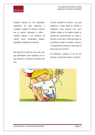 El documento habla sobre el valor de ser maestro. Explica que los maestros a menudo enfrentan comentarios que infravaloran su profesión. También dedican mucho tiempo fuera del aula para planificar lecciones memorables y ayudar a cada estudiante. Finalmente, los maestros enseñan más que contenido académico, ayudando a los estudiantes a desarrollar valores como la solidaridad y el respeto.