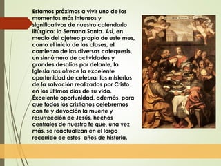La Semana Santa conmemora los misterios centrales de la fe cristiana: la pasión, muerte y resurrección de Jesucristo. Comienza con el Domingo de Ramos y la entrada triunfal de Jesús a Jerusalén. Culmina con la Pascua, donde la Iglesia celebra la victoria de Cristo sobre la muerte a través de la liturgia de la Vigilia Pascual y la renovación de promesas bautismales.