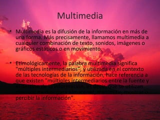 Multimedia se refiere a la difusión de información a través de múltiples medios como texto, sonido, imágenes y video. La evolución de la multimedia comenzó en la década de 1960 con ideas como la hipermedia y sistemas que integraban diferentes medios. En la década de 1980 surgieron los primeros programas y juegos multimedia, y en la década de 1990 se integraron completamente el audio, video, gráficos y animación. Actualmente, las aplicaciones multimedia permiten la interactividad y facilitan la comunicación y procesamiento de información