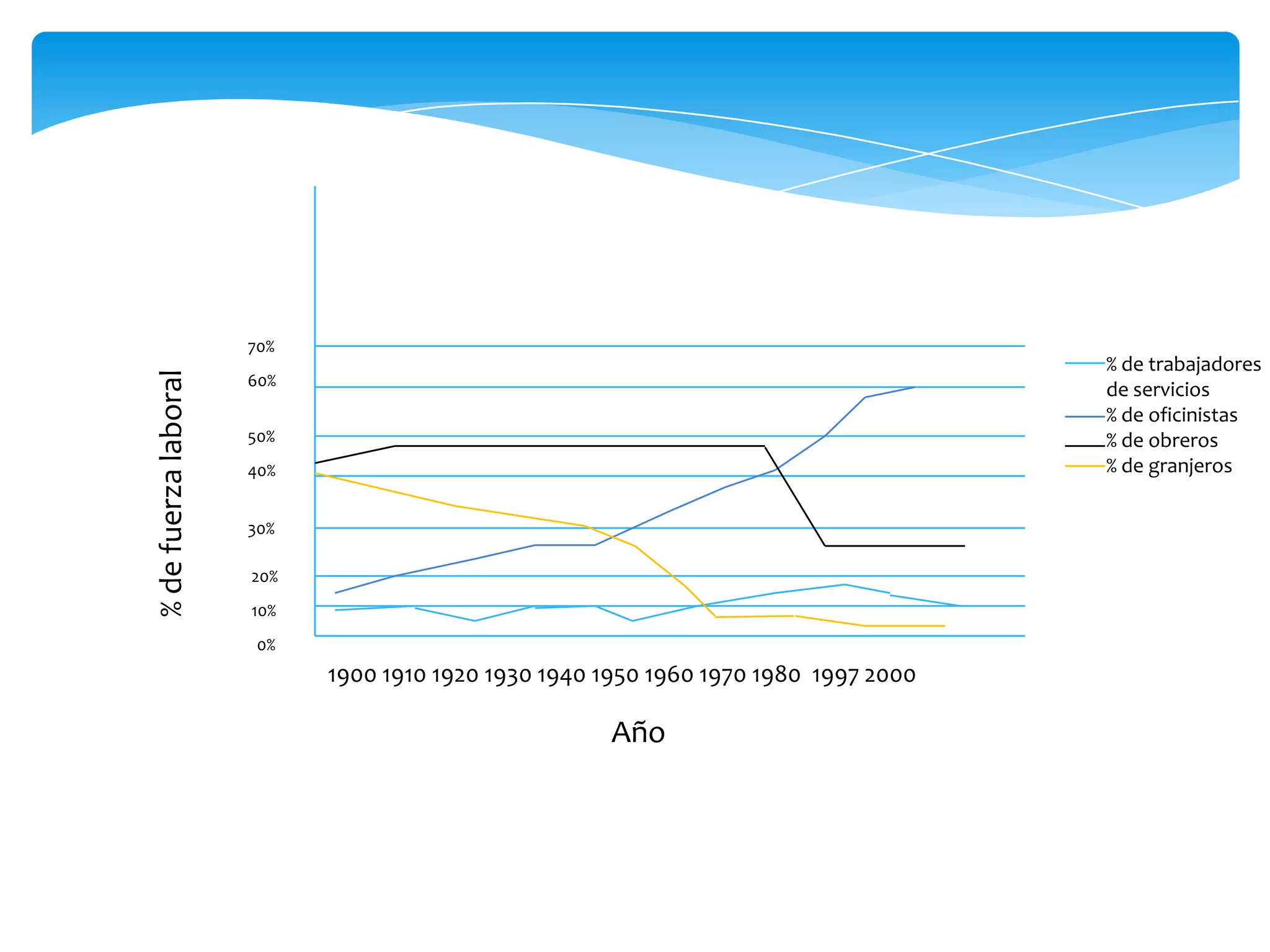 El documento presenta datos sobre la evolución de la composición de la fuerza laboral en Estados Unidos entre 1900 y 2000. Muestra que el porcentaje de trabajadores de servicios aumentó del 30% en 1900 al 70% en 2000, mientras que el porcentaje de obreros y granjeros disminuyó en ese período. Adicionalmente, presenta datos sobre las ventas de un supermercado en el noroeste de Estados Unidos durante 1997, incluyendo los productos y unidades vendidas.