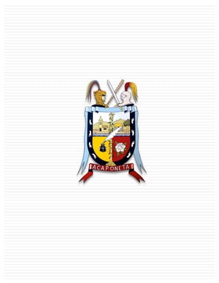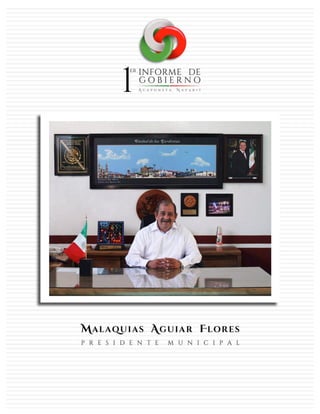 Este documento presenta el 1er Informe de Gobierno del Presidente Municipal de Acaponeta, Nayarit. El informe describe los logros obtenidos en los primeros 12 meses de gobierno en áreas como salud, educación, desarrollo económico, servicios públicos, valores ciudadanos y gobierno moderno. El Presidente agradece el apoyo del gobierno federal y estatal y reconoce los esfuerzos conjuntos para mejorar las condiciones de vida de los habitantes de Acaponeta.