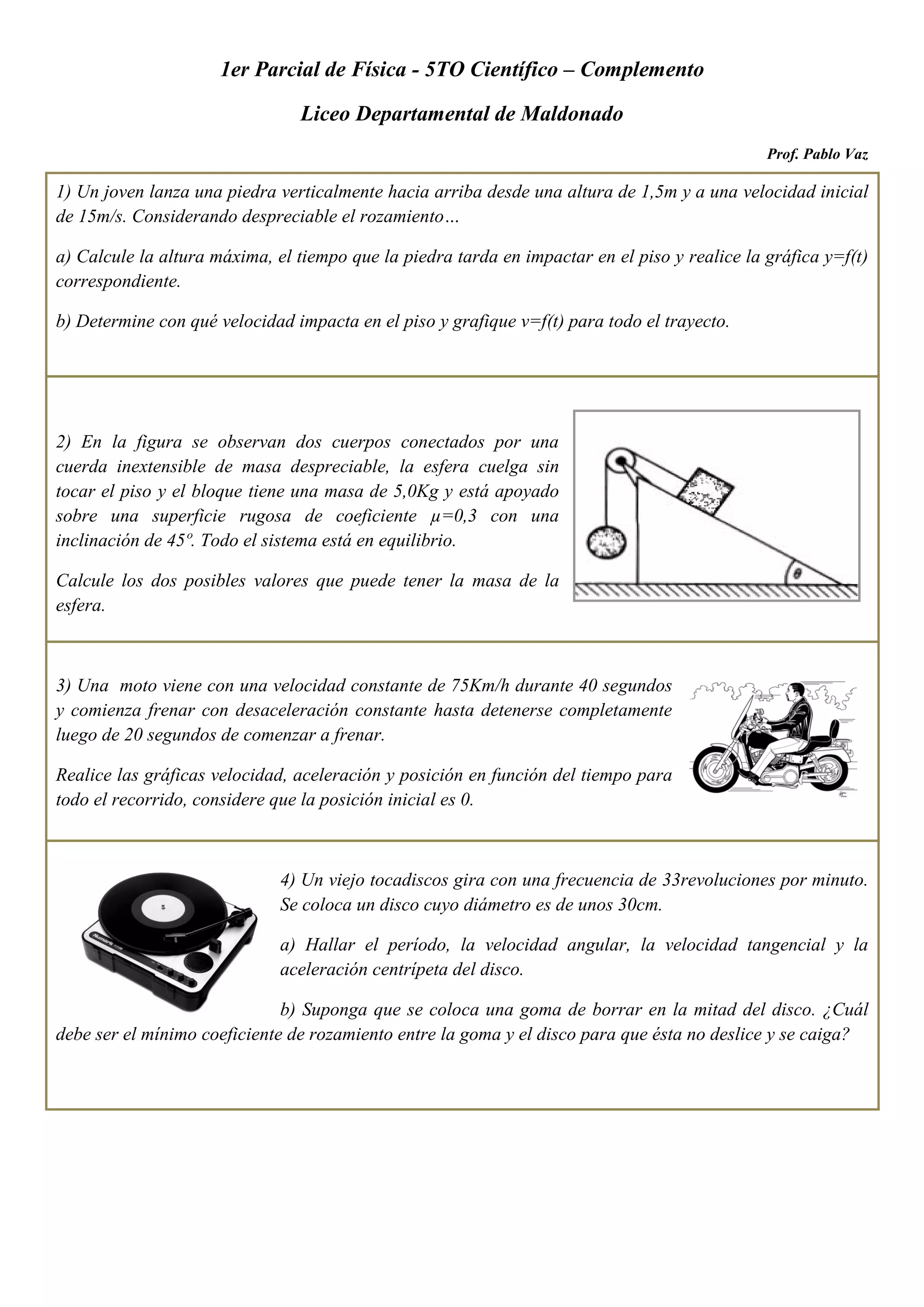 El documento presenta 4 problemas de física. El primero involucra el movimiento vertical de una piedra lanzada hacia arriba. El segundo analiza el equilibrio de dos cuerpos conectados por una cuerda. El tercero grafica la velocidad, aceleración y posición de una moto que frena después de viajar a velocidad constante. El cuarto calcula variables como el período y la aceleración centrípeta de un tocadiscos, y determina el coeficiente de rozamiento mínimo para evitar que una goma se deslice.