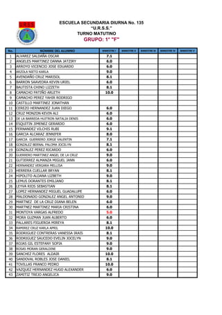 Este documento presenta las calificaciones de 43 estudiantes en 5 bimestres. Incluye el nombre de cada estudiante y sus calificaciones en cada periodo escolar, con calificaciones que van de 5 a 10.