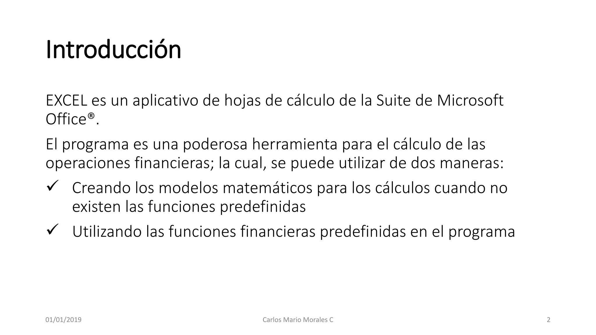 Este documento describe cómo usar Excel para calcular operaciones financieras con interés simple. Explica que Excel permite crear modelos matemáticos cuando no hay funciones predefinidas, y también usar funciones financieras existentes. Luego detalla los pasos para crear un modelo en Excel para calcular el valor presente, incluyendo ingresar fechas, calcular la duración, y usar la fórmula VP = VF/(1+i*n). Finalmente, indica que se pueden calcular otras variables financieras de manera similar.