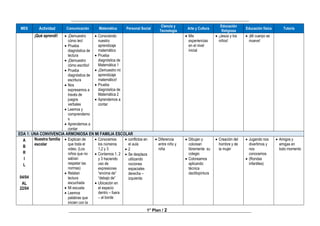Este documento presenta el plan de estudios de primer grado organizado por áreas de actividad para cada mes. Cubre temas como comunicación, matemáticas, ciencias sociales, ciencia y tecnología, arte y cultura, educación religiosa y educación física. El plan incluye objetivos y actividades específicas para cada área a desarrollar cada mes con el fin de enseñar diversos contenidos académicos y formativos a los estudiantes de primer grado.